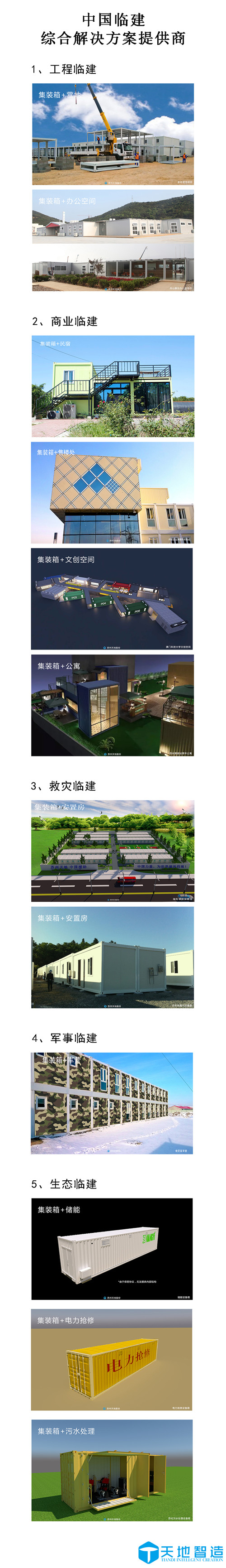 作為中國臨建綜合解決(jué)方(fāng)案(àn)提供商,蘇州丝瓜视频官网始終致力於臨時建(jiàn)築的創造與探索,並率先提出(chū)“中(zhōng)國臨建”的概念,以集裝箱為主體,形成了能夠滿足客戶不同定製需求的五大臨建係列產品(pǐn):工程臨建、商業臨建、救災臨(lín)建、軍事臨建和生態臨建臨建。